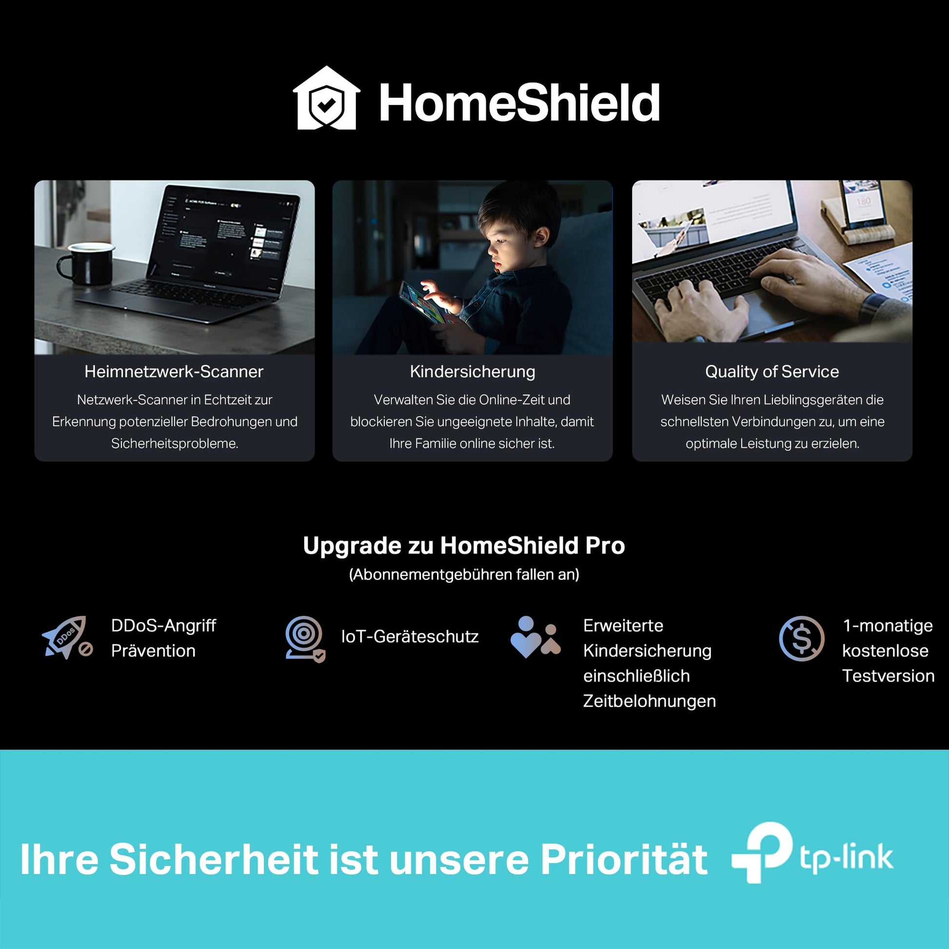 - 𝗧𝗣-𝗟𝗶𝗻𝗸 𝗛𝗼𝗺𝗲𝗦𝗵𝗶𝗲𝗹𝗱 - Der Premium-Sicherheitsdienst von TP-Link schützt Ihr Heimnetzwerk mit modernstem Netzwerkschutz und IoT-Schutz. Kostenlose Funktionen: 1. Grundlegende Netzwerksicherheit einschließlich Sicherheitsscan und IoT-Geräteerkennung 2. Grundlegende Kindersicherung 3. Quality of Service 4. Grundlegende Wochen-/Monatsberichte. Besuchen Sie die TP-Link-Website für weitere Informationen.